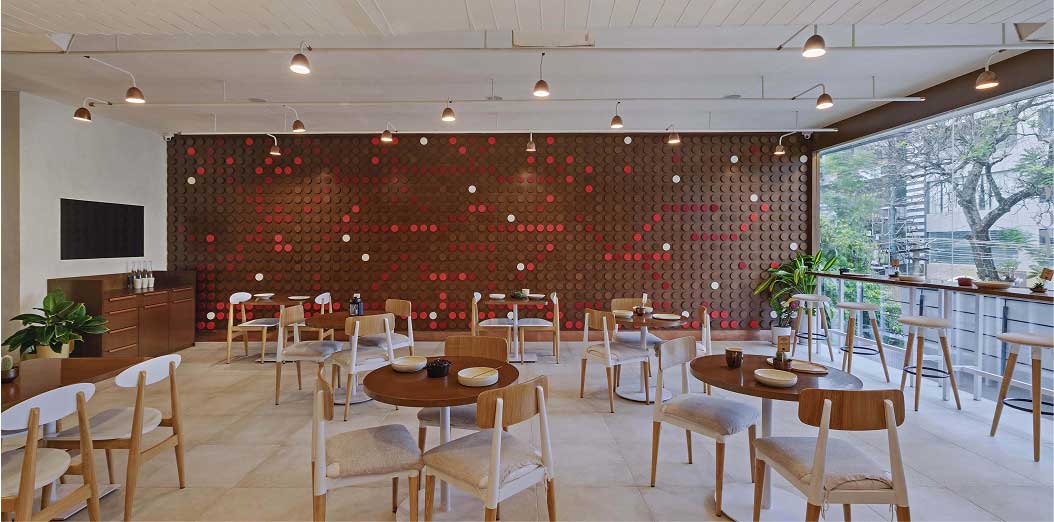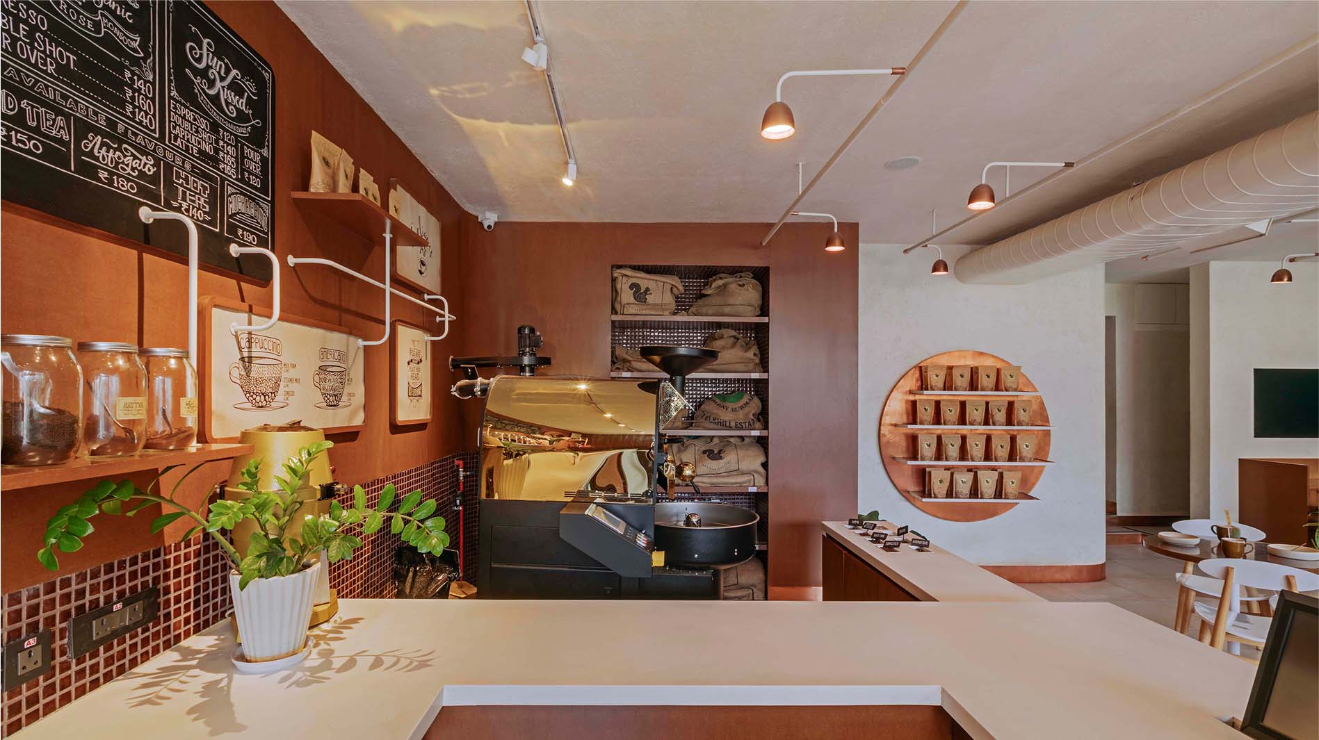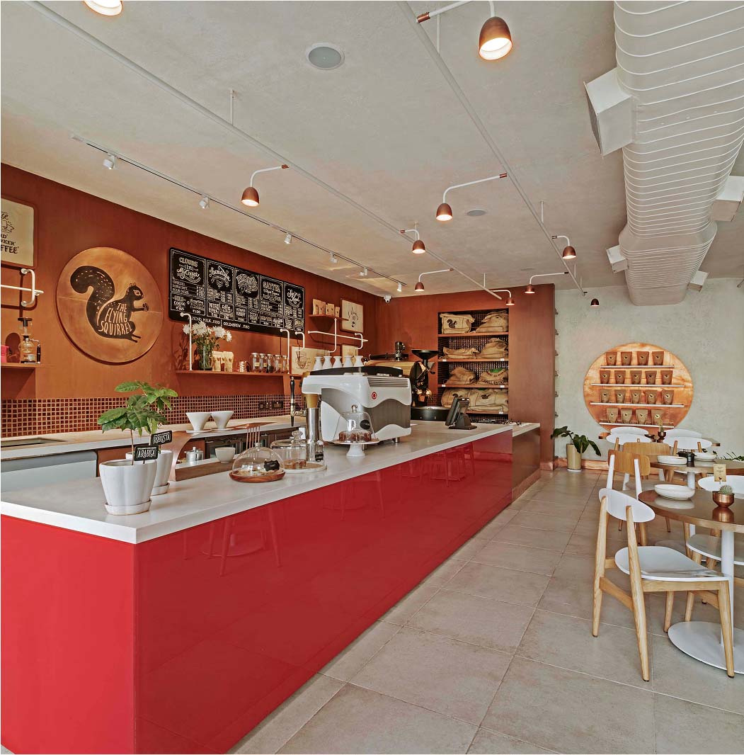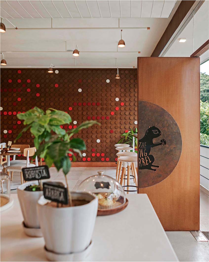The spatial narrative draws its inspiration from the delicate coffee berry, its organic growth patterns, vibrants crimson hues and spherical geometry. Polished MDF, oxidised copper and deep red laminated glass, together establish a visual language that speaks to the process from bean to brew.