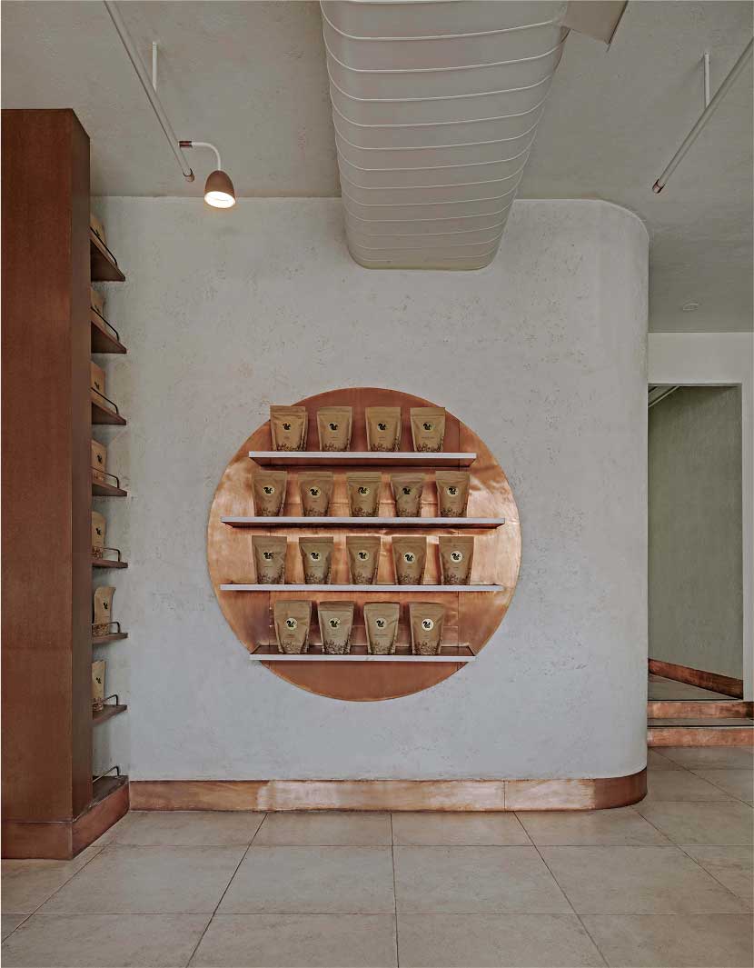 Copper is used strategically throughout to create visual anchors and infuse. It lends a bold and tactile richness. A commanding circular copper sheet forms the backdrop of the retail display. This language also extends to the smallest details, from the logo-engraved door handle, furniture beading, to the skirting.