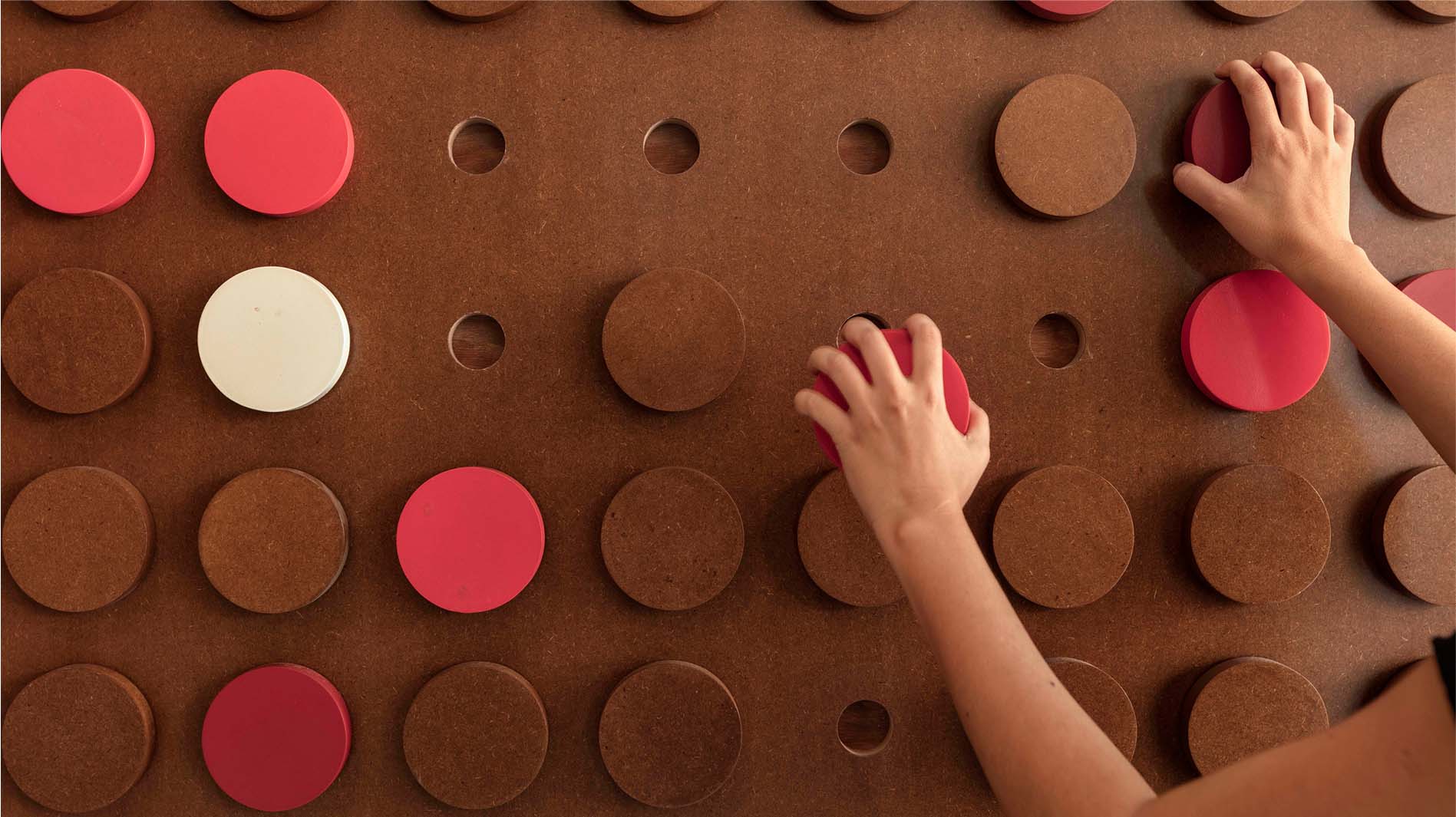A dynamic installation wall anchors the space. Comprising 1365 individual MDF discs, finished in a natural polish it amplifies the prevalent raw character. The visitors can unpeg and reposition the discs, transforming the wall into an ever-changing canvas of collective expression.