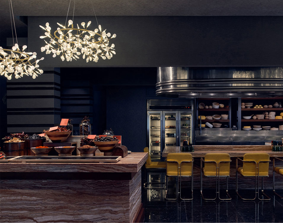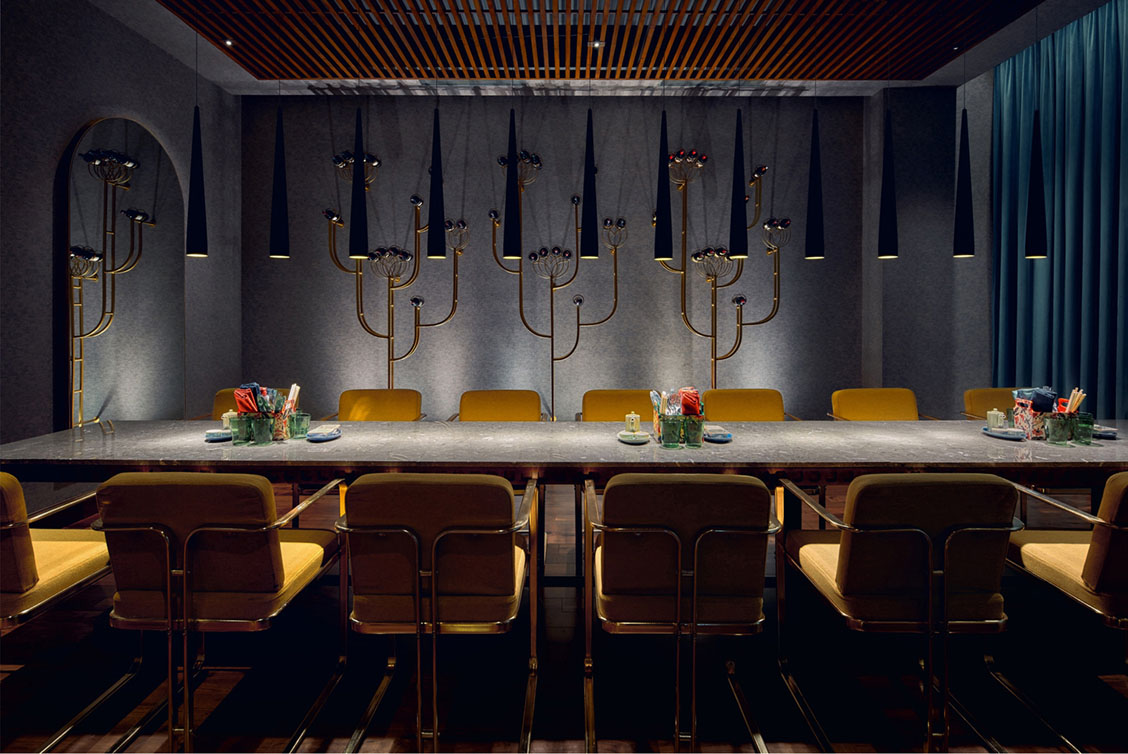 Rooted in the fiery allure of its namesake spice ‘Paprika’, Rika presents Asian dining experience through the lens of chillies. The intent was to compose a theatrical culinary journey transcending conventional hotel dining experiences. Conceived as a space bringing together the exclusivity of luxury hotels with the energy of street dining, the space crafts an atmosphere that is bold, sensorial and deliberately dramatic.