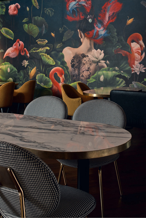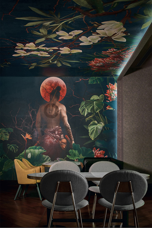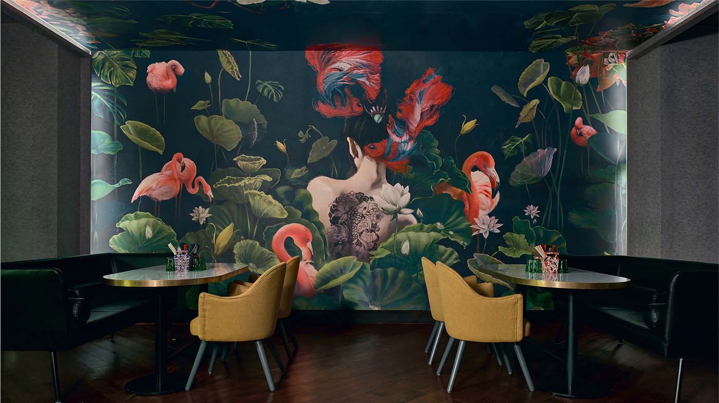 Youthful furniture silhouettes and moody lighting soften the luxurious material palette. Two striking murals anchor the space as portals into an aquatic dreamscape, with interpretations of East Asian iconography like koi fish, warriors and flamingos. These commissioned works, born from traditional sketching and digital precision, draw the gaze while providing intimate backdrops for dining experiences.
