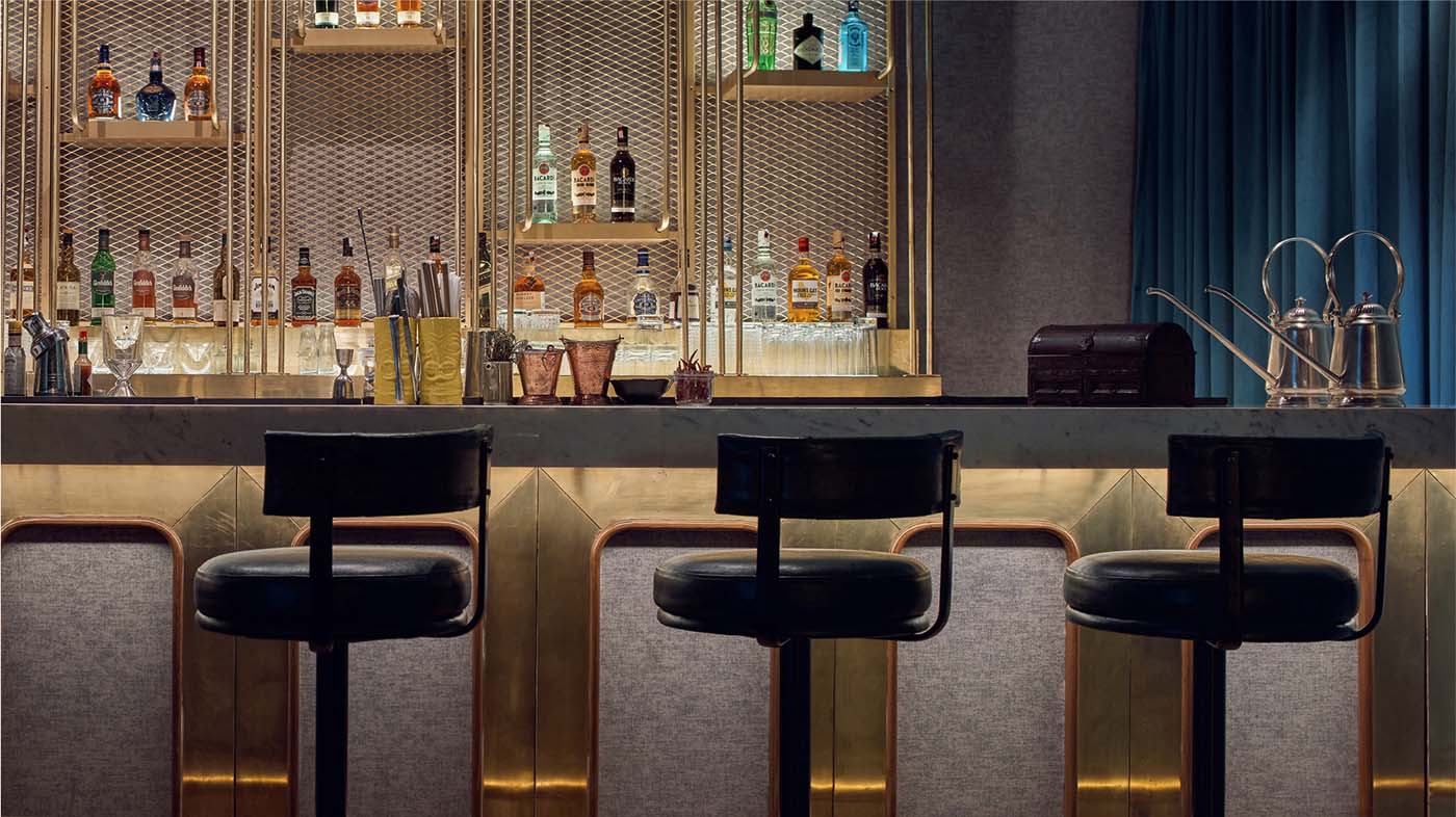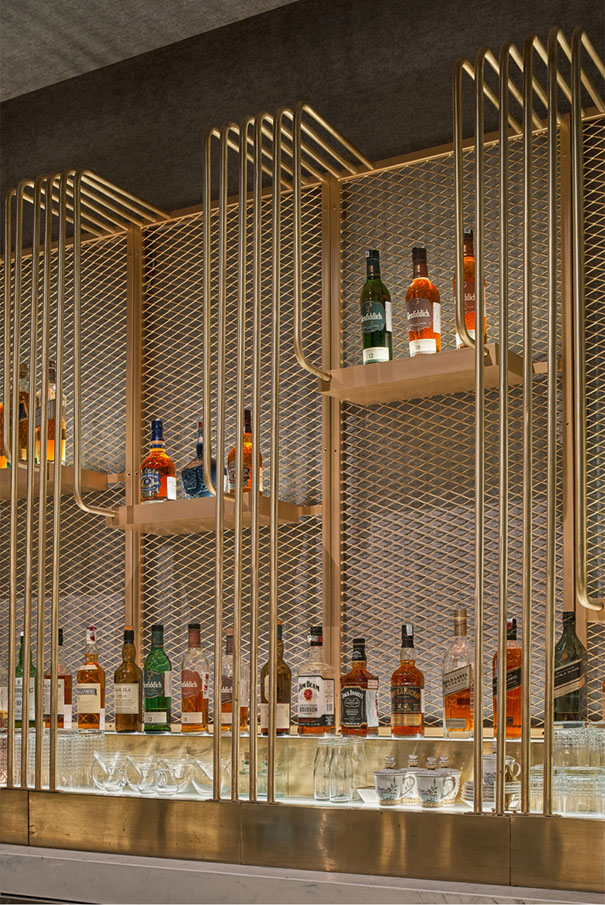 The material palette speaks in dualities, sophisticated brass and marble add gravitas, while youthful furniture selections and dreamlike lighting introduce playful energy. A key anchor of the space, the front bar emerges as a composition of layered brass panels in conversation with fluted wood. Behind, the back bar reveals a meticulously arranged liquor library. Bottles become luminous sculptures, lit from below against stepped displays, enclosed by a shimmering veil of metal mesh and brass pipes.