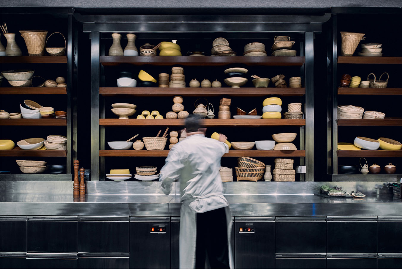 The spatial journey unfolds across a linear framework. At its heart lies the teppanyaki counter, much like a stage where culinary artistry becomes performance, positioning guests as both audience and participant. This central placement creates natural circulation patterns that draw movement through the space. Adjacent displays of chilies sourced from around the world serve as both functional storage and edible archives reinforcing the restaurant’s conceptual identity.